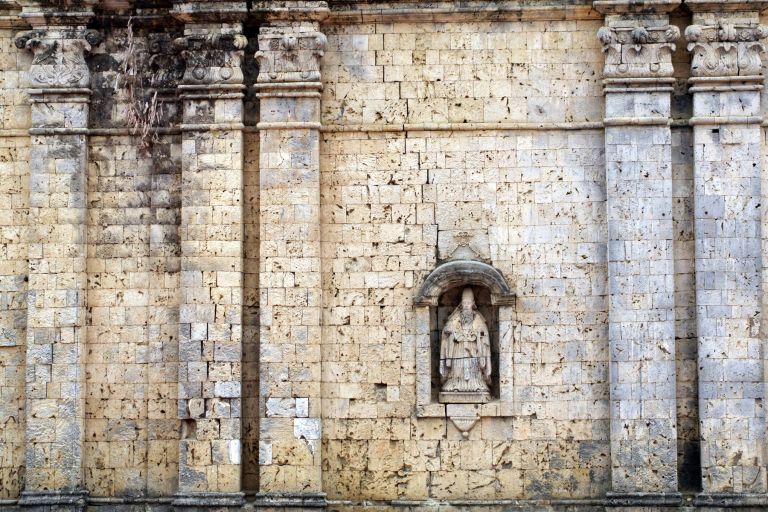 Subject: Detail of stone carving on the facade of Santa Monica Parish Church, also called Panay Church, near Roxas City in Capiz province. It was built in 1884 on the site of an earlier church, built