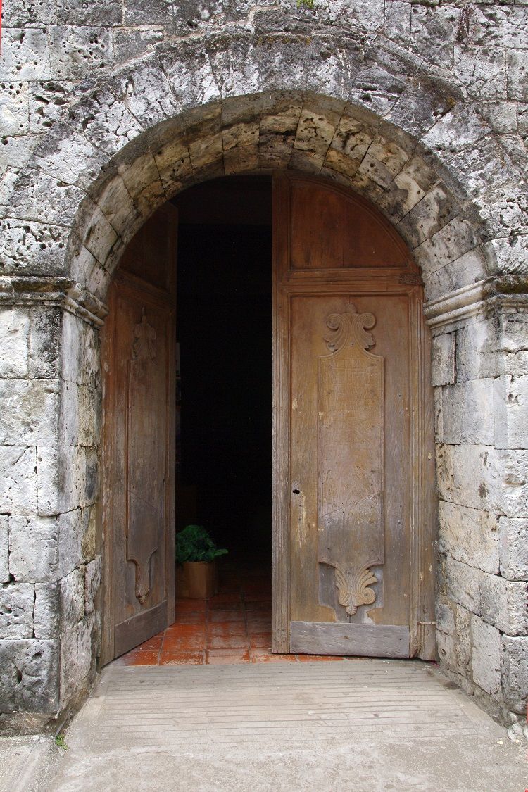 Subject: Detail of stone arched doorway and wooden church doors of Santa Monica Parish Church, also called Panay Church, near Roxas City in Capiz province. It was built in 1884 on the site of an earli