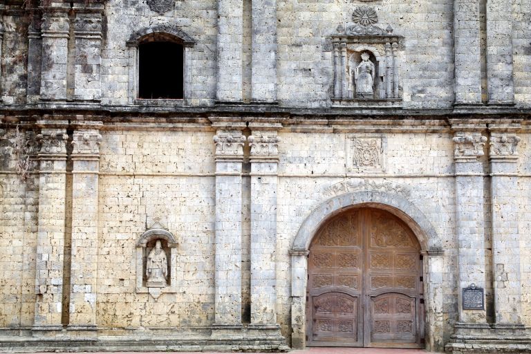 Subject: Detail of church doorway and stone carvings of Santa Monica Parish Church, also called Panay Church, near Roxas City in Capiz province. It was built in 1884 on the site of an earlier church,