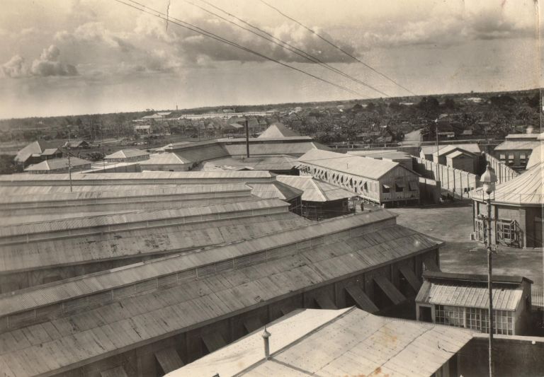 Subject: Interior view of Bilibid Prison buildings in Santa Cruz, Manila, spoke-and-wheel layout with long narrow cellblocks radially extending from circular center building. This is the left side ima