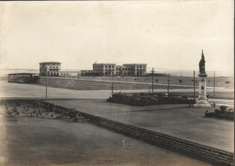 Subject: How lonely they looked back then! View from Luneta across Burnham Green to Elks Club and Army-Navy Club in Ermita; Legaspi and Urdeneta monument in foreground. See also OFI-000645 for a nearl