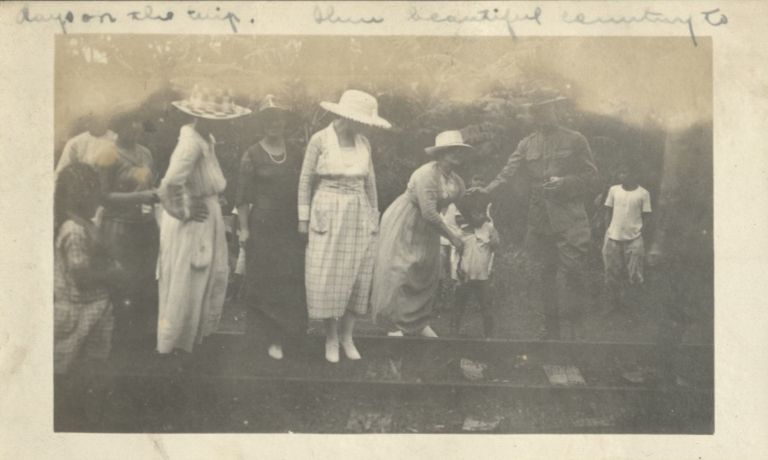 Subject: American military wives, an officer, and Filipino children stand on and around railroad tracks during their trip to Pagsanjan. Part of a series that covers OFI-004600-4604 and OFI-004614-4616