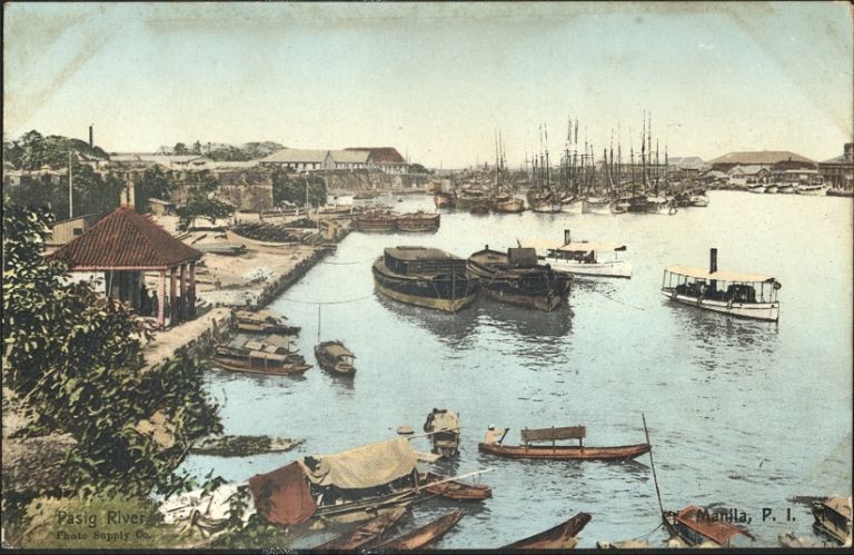 Subject: Pasig River scene with sailing ships, boats and ferries in Manila.
