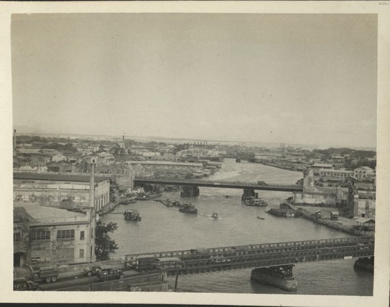 Subject: Post-war reconstruction is in full swing here, which makes identifying the bridges complicated. They are probably the Santa Cruz Bridge (bottom, with army trucks crossing); Quezon Bridge (cen