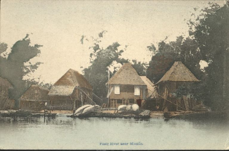 Subject: Nipa houses and small boats along Pasig River.