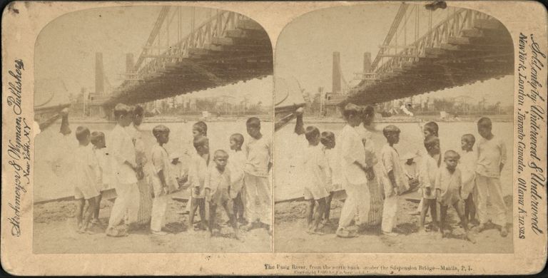 Underwood #U140a. Group of boys gather on Pasig River bank under Suspension Bridge. Construction on the Puente Colgante suspension bridge across the Pasig River started in 1849 and was completed in 1852 and remained in use until the mid-1930s.