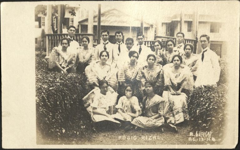 Subject: Group of 19 unidentified Filipino men and women (classmates?) in traditional dress pose standing and seated outdoors in Pasig City.