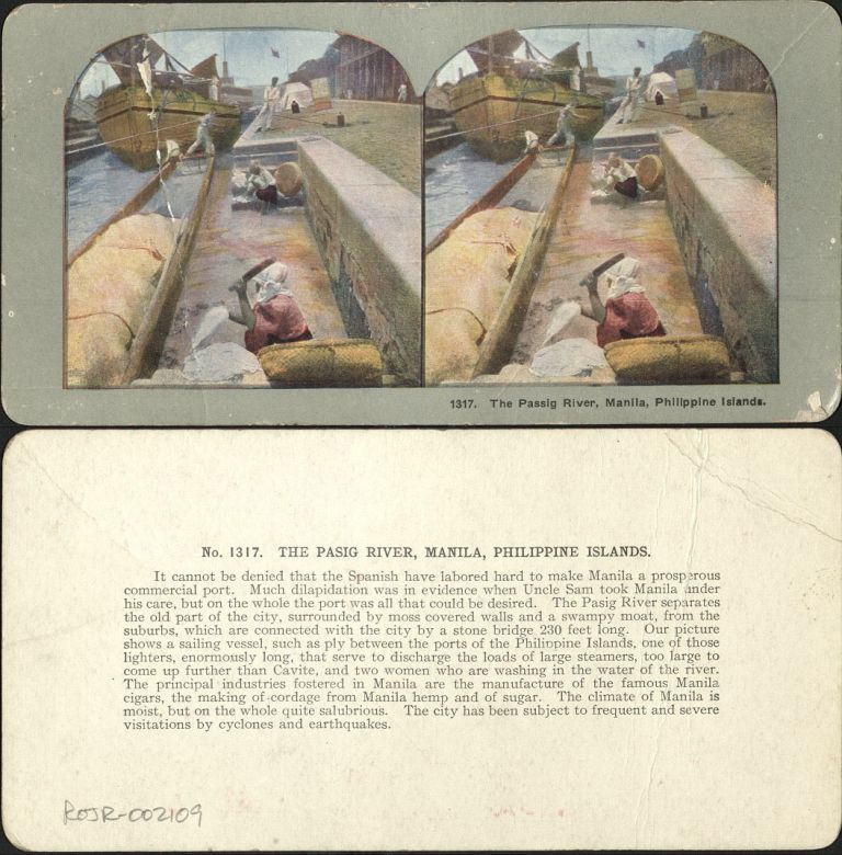 Ingersoll #IN1317. Filipino women washing clothes on steps down to Pasig River, Manila, Philippines; ships in background.