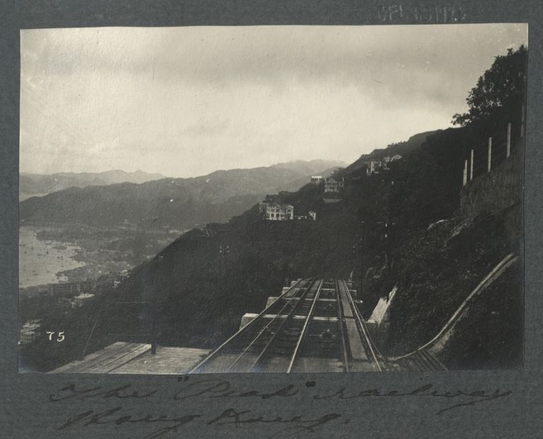 Subject: View from lookout on top of Victoria Peak in Hong Kong, showing the tramway rails leading up. Prior to the tramway, access to the Peak was by sedan chair. "With the commencement of