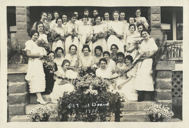 Subject: Those Greek letters represent Phi Sigma Tau, so this is a group photo of sorority sisters at Doane College (now Doane University), a private liberal arts college in Crete, Nebraska. Perhaps t