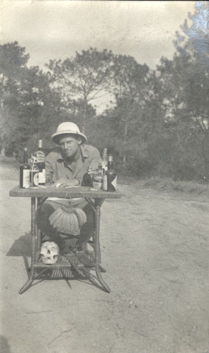 Subject: Teacher F. Guyon Bull stages a bit of amateur theater on a lawn at Brent School Baguio, sitting at a table full of liquor bottles. The Episcopalian Bishop Charles Henry Brent founded Brent Sc