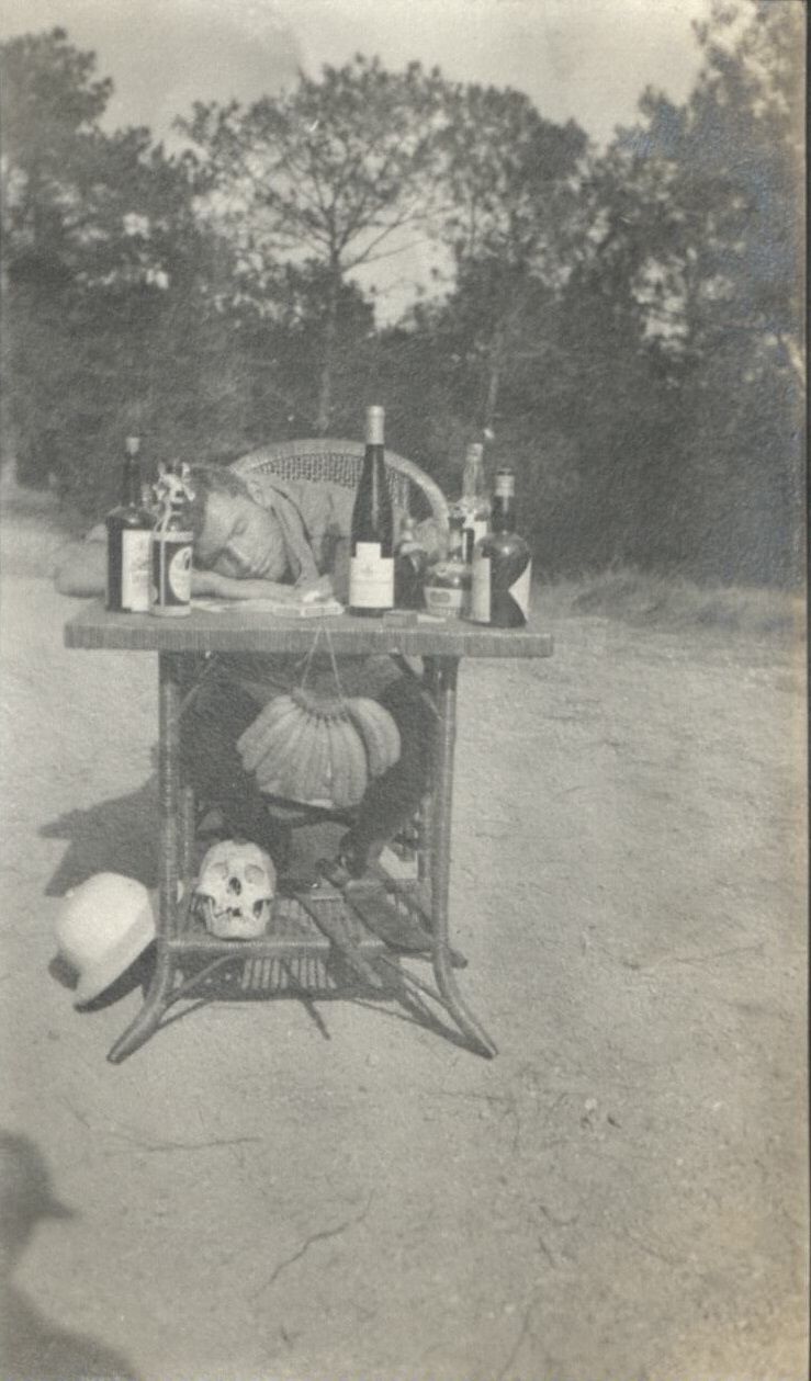 Subject: Teacher F. Guyon Bull stages a bit of amateur theater on a lawn at Brent School Baguio, passed out at a table full of liquor bottles. The Episcopalian Bishop Charles Henry Brent founded Brent