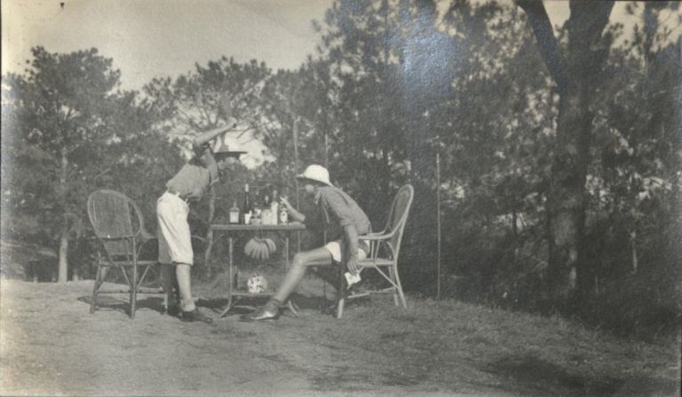 Subject: Rev. Alfred Leslie Griffiths and teacher F. Guyon Bull stage a bit of amateur theater on a lawn at Brent School Baguio. The Episcopalian Bishop Charles Henry Brent founded Brent School Baguio