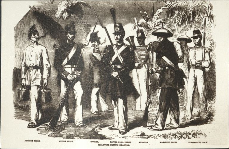 Subject: Engraving or pen & ink drawing showing the various uniforms of Philippine officers and soldiers. Although not specified, these prints are s
