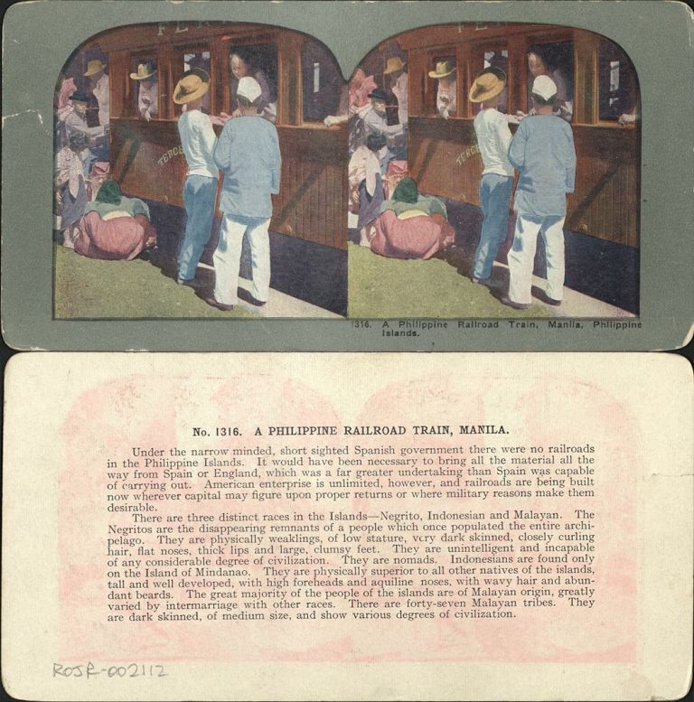Ingersoll #IN1316. Filipinos talk to passengers embarking on a passenger train at a Manila railway station.