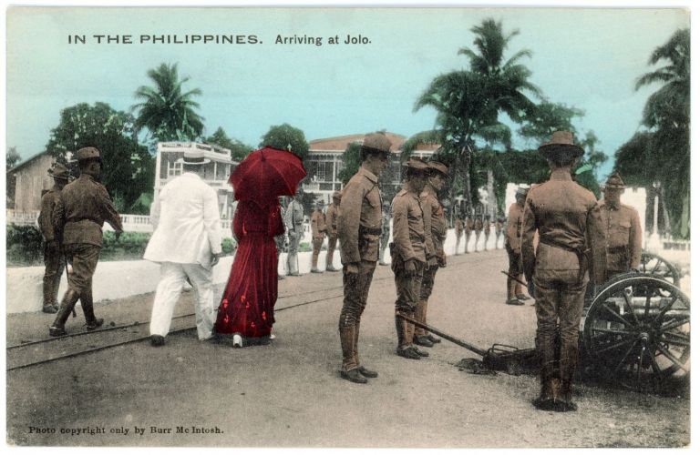 Full caption: "Secretary Taft and Miss Alice Roosevelt (on their way to meet the Sultan of Sulu) passing through the lines of the Twentieth U.S. Infantry", during their 1905 visit to Jolo