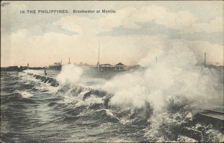 Subject: �Waves before a typhoon dashing from the breakwater on to �The Lunetta� [Luneta] the public square of Manila.�