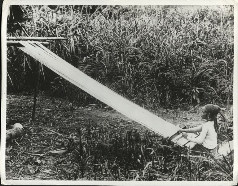Subject: Despite the caption, this image looks much more like a Filipina weaving on a simple loom outdoors. (See ROJR-001606, ROJR-000087, and ROJR-001559 for similar images).