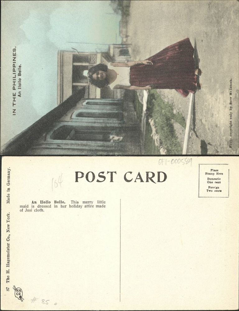 Smiling young woman stands in the street of Iloilo. Full caption: "This merry little maid is dressed in her holiday attire made of Jusi cloth."