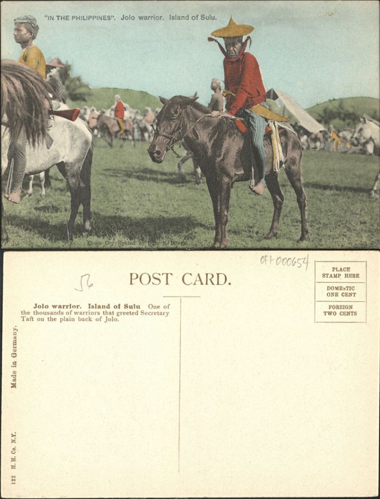 Philippine Muslim men on horseback in bright clothes in a field in Jolo. Full caption: "One of the thousands of warriors that greeted Secretary Taft on the plain back of Jolo."