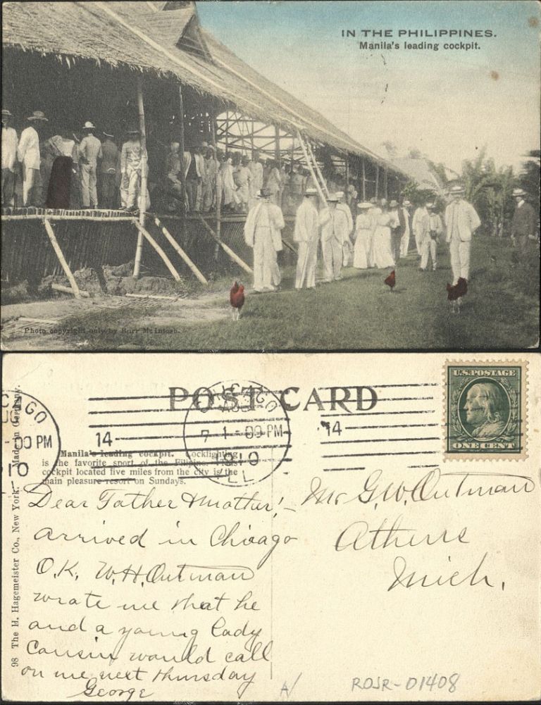 Subject: Full caption: �Cockfighting is the favorite sport of the Filipino. This cockpit located five miles from the city is the main pleasure resort on Sundays.�