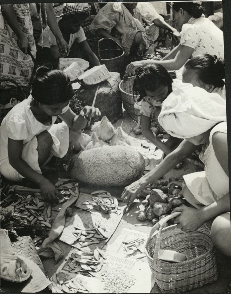 Subject: Filipino women picking produce at an outdoor market, including beans, camotes or sweet potatoes, and breadfruit.