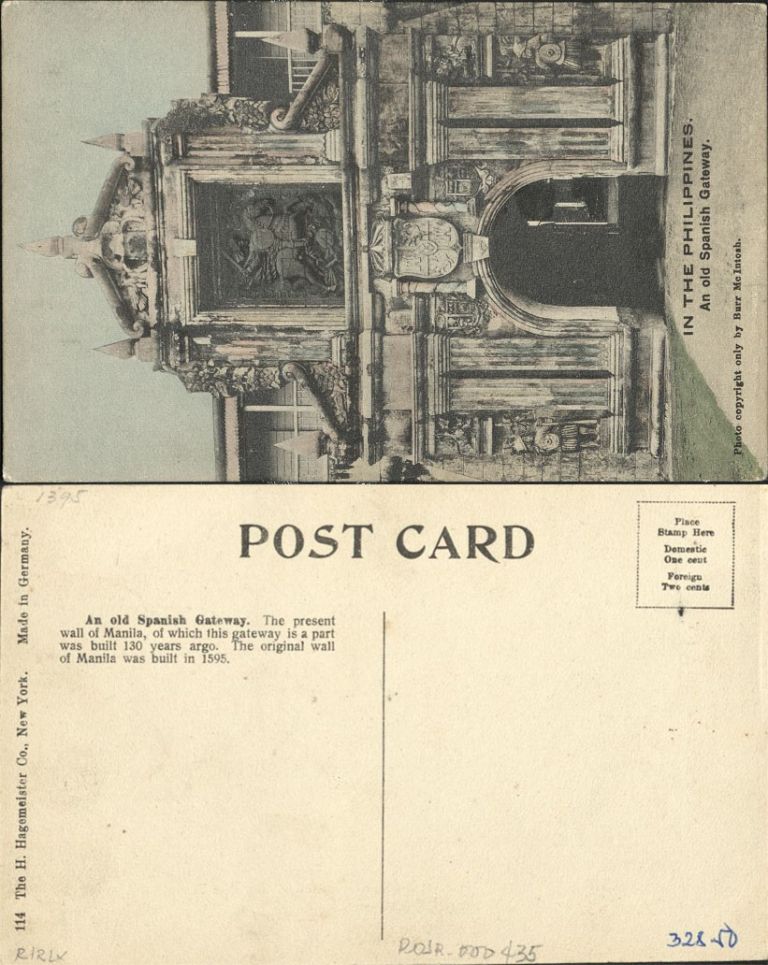 Subject: Detailed view of ornate stone entrance gate into interior of Fort Santiago in Intramuros, Manila.