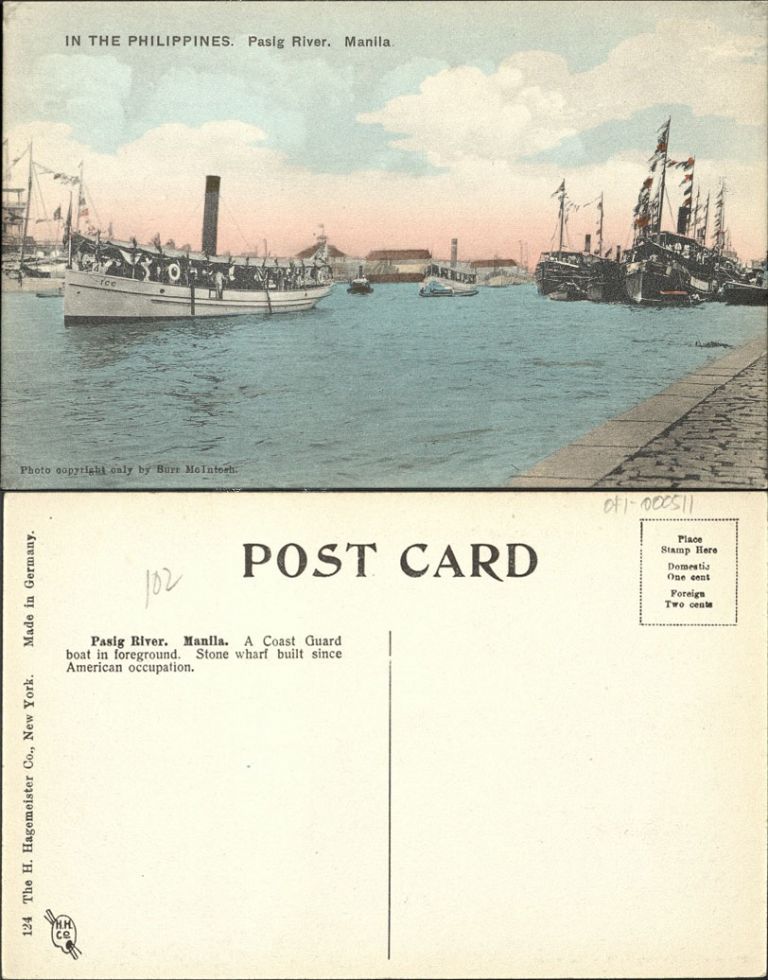 Passenger boats and cargo ships in the Pasig River at Manila. Full caption: "A Coast Guard boat in foreground. Stone wharf built since American occupation."