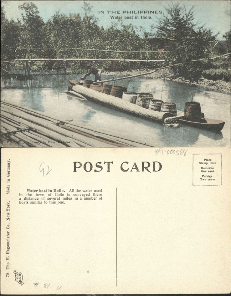 Piping water into barrels on a small boat on river. Full caption: �All the water used in the town of Iloilo is conveyed there a distance of several miles in a number of boats similar to this one.