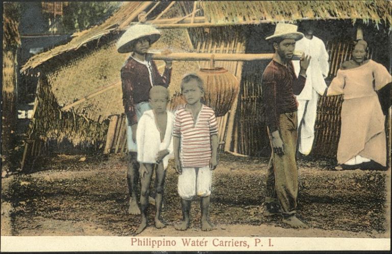 Subject: Two Filipino men in hats carry a large pot on a shoulder pole between them; two boys stand in front.
