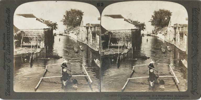 Underwood #U4616. View from bridge of men paddling outrigger canoe on canal in Malolos, Philippines.