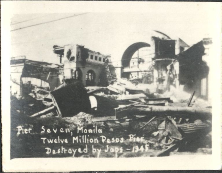 Subject: The battle-damaged entrance to Pier 7 seen over a destroyed building in Manila's Port District. During the battle for the liberation of Manila in Feb. 1945, the fleeing Japanese destroyed muc