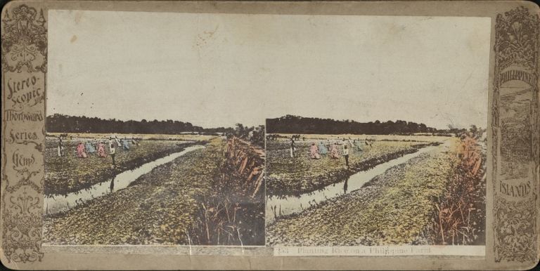Stereoscopic Gems #L253. View of Filipinos planting rice in a field beyond an irrigation ditch.