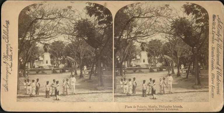 Underwood #U50. View of children and adults standing by tree-lined park with statue.
