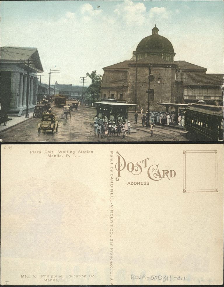 Subject: Passengers waiting at streetcar stop at Plaza Goiti [now Plaza Lacson] with Santa Cruz Church, Monte de Piedad Building, calesas, automobile, streetcar and pedestrians.