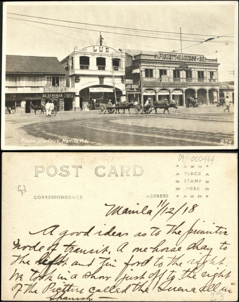 Plaza Santa Cruz in Manila, showing carabaos with carts, an early Ford automobile, the Lux and the Pickett Harness Co. Plaza Sta. Cruz is just north of the Santa Cruz Church and Plaza Goiti.