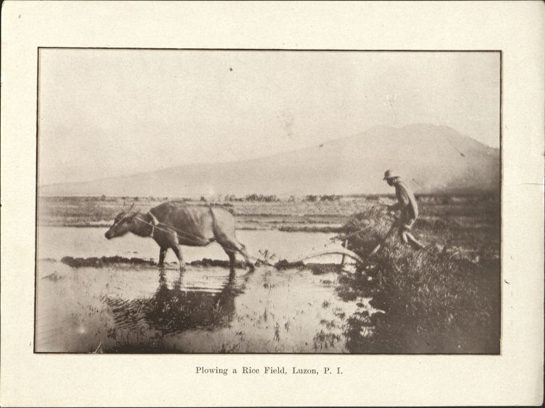 Subject: Filipino man with a carabao is plowing a flooded rice paddy in preparation for planting. Givens was the post photographer at the Presidio of San Francisco starting in 1899. In 190