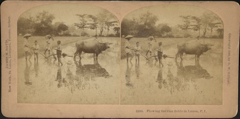 Kilburn #B13563. Filipino men and boys use a carabao to plow a flooded rice paddy.