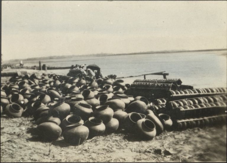 Subject: Pottery urns, both loose and in racks, on the bank of the Pasig River. Likely this is production being shipped for sale in Manila.