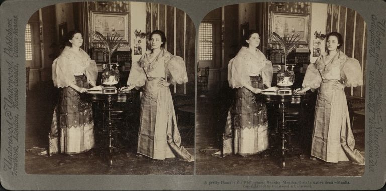 Underwood #U455. Two mestizo (mixed race, Spanish and Filipino) women stand in formal parlor in traditional dress.