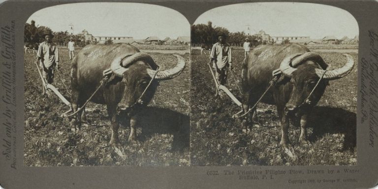 Griffith #F6532. Filipino farmer plows a field using a carabao..