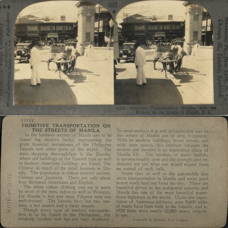 Keystone #K33951-I. Carabao pulls cart along Escolta street, sharing road with automobiles and trucks.