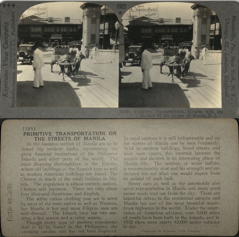 Primitive Transportation Mingles with the Modern on the Streets of Manila, P. I.