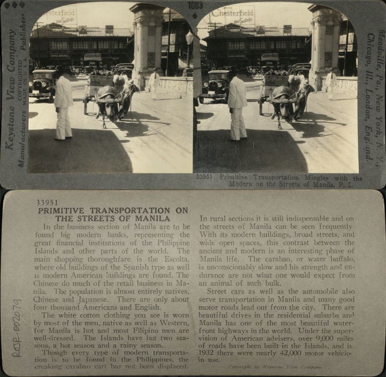 Primitive Transportation Mingles with the Modern on the Streets of Manila, P. I.