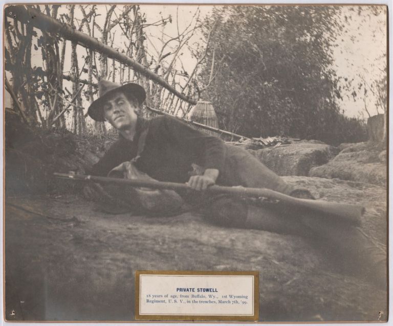 Images in this sub-series appear to be from a travelling exhibit by Wanton Stanley Webb. Full captions reads: Private Stowell 18 years of age, from Bufallo, Wy., 1st Wyoming Regiment, U.S.V., in the trenches, March 7th, '99."