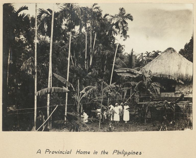 Subject: Four Caucasians (two men and two women) stand with some young Filipinos outside a nipa hut under coconut palms. The Caucasians may be schoolteachers or missionaries. It's unclear