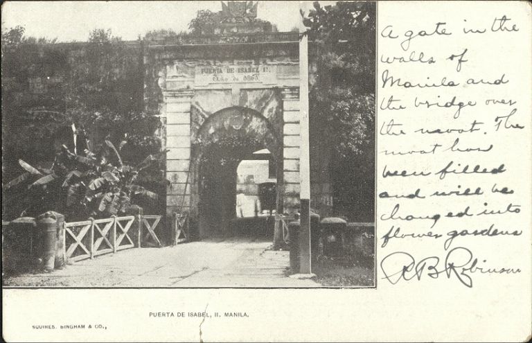 Subject: Puerta de Isabel II, opened in 1861, was the last gate to be built in Intramuros. It was intended to reduce heavy pedestrian traffic outside the Parian Gate to the Bridge of Spain and Binond