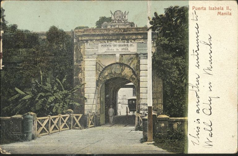 Subject: Puerta de Isabel II, opened in 1861, was the last gate to be built in Intramuros. It was intended to reduce heavy pedestrian traffic outside the Parian Gate to the Bridge of Spain and Binond