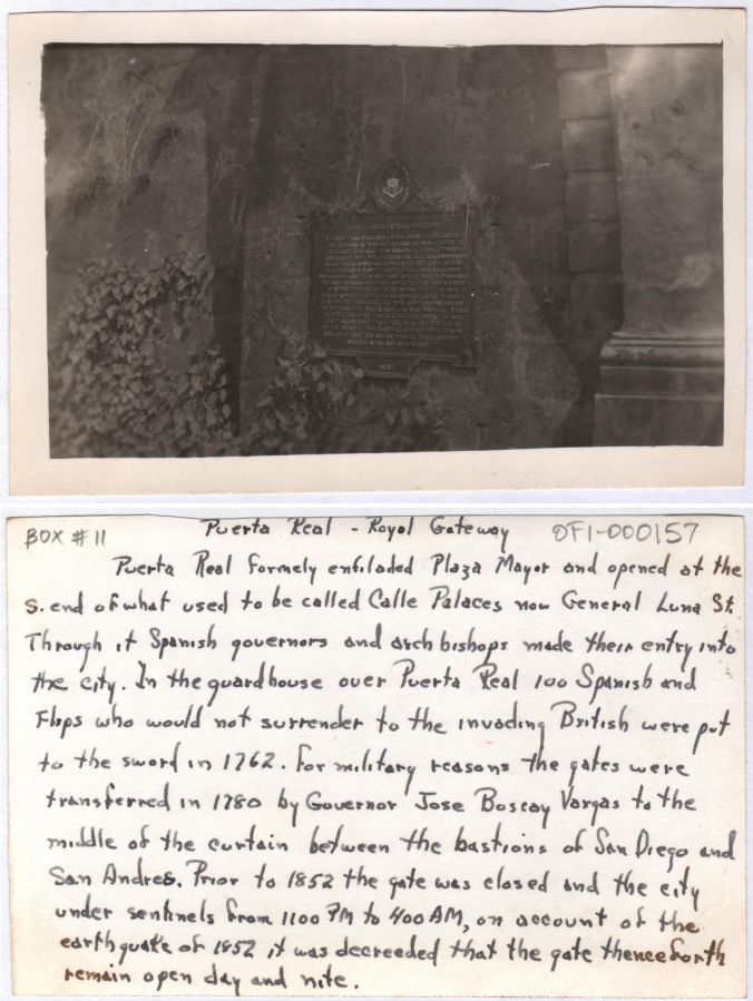 The historical marker beside the Puerta Real or Royal Gate, used by Spanish governors and archbishops. The full text of the marker appears on the back of this photograph. Images in this album are from an American soldier in the U.S. Army 13th Air Force stationed at Clark Field.