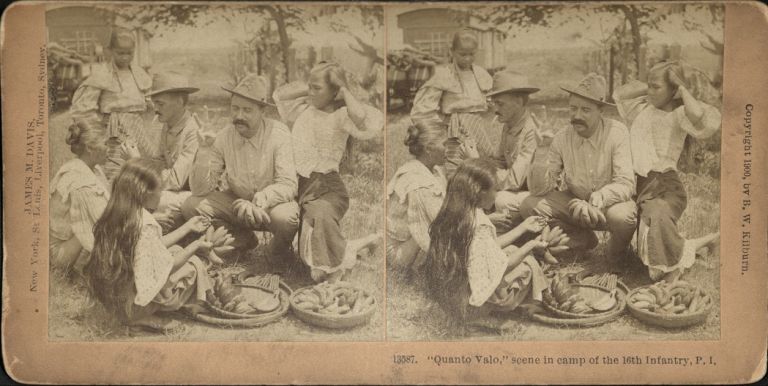 Kilburn #B13587. U.S. soldiers buying bananas from local Filipina women near army camp.